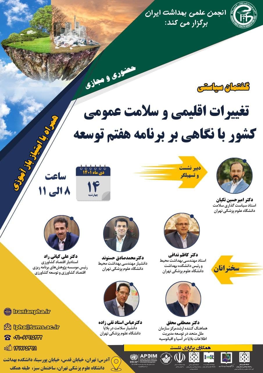 گفتمان سیاستی "تغییرات اقلیم و سلامت عمومی کشور با نگاهی به برنامه هفتم توسعه"، با همکاری پژوهشکده محیط و دانشکده بهداشت دانشگاه علوم پزشکی تهران و انجمن علمی بهداشت محیط ایران در تاریخ ۱۴ دیماه توسط انجمن علمی بهداشت ایران درسالن شهدای دانشکده بهداشت برگزار می گردد.