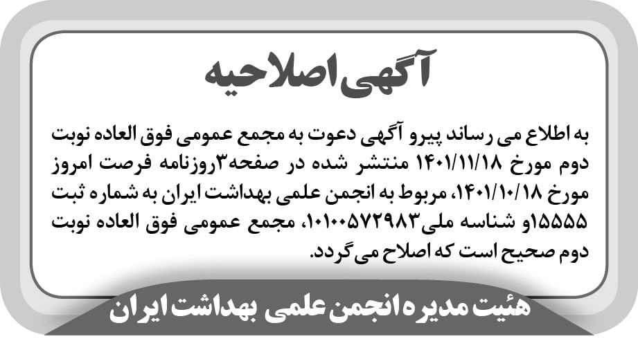 به اطلاع می رساند پیرو آگهی دعوت به مجمع عمومی فوق العاده نوبت دوم مورخ ۱۸/۱۱/۱۴۰۱ منتشر شده در صفحه۳روزنامه فرصت امروز مورخ ۱۸/۱۰/۱۴۰۱، مربوط به انجمن علمی بهداشت ایران به شماره ثبت ۱۵۵۵۵و شناسه ملی۱۰۱۰۰۵۷۲۹۸۳، مجمع عمومی فوق العاده نوبت دوم می باشد که اصلاح می گردد.